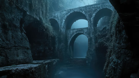 Explore an enchanting scene of ancient ruins enveloped in fog, featuring stone archways and tranquil waters. A captivating atmosphere of mystery.