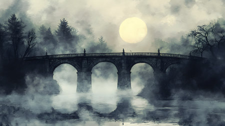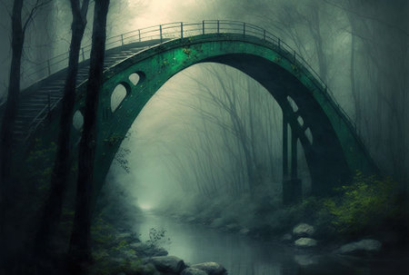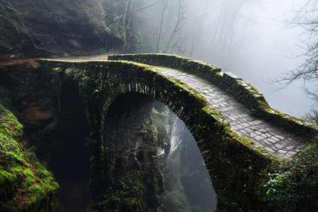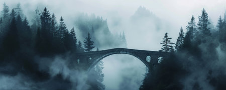 Ancient stone bridge over a misty river, mysterious road, timeless journey