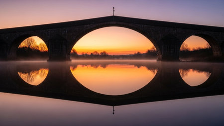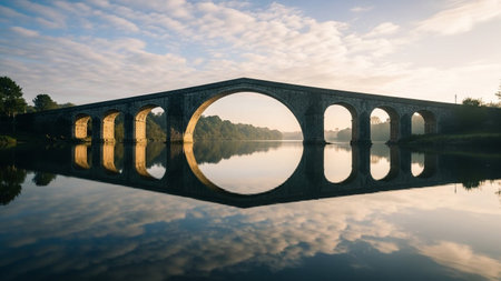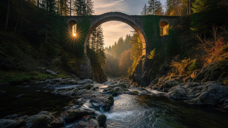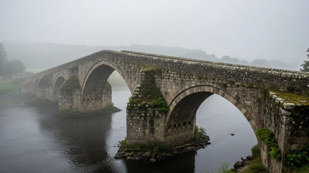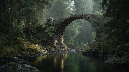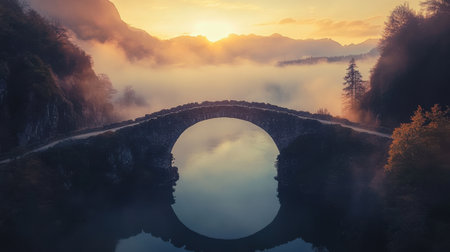 A beautiful stone bridge gracefully arches over a tranquil river, set against a backdrop of misty trees and soft morning light, evoking peace.