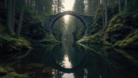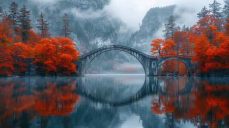 Tranquil reflection of ancient bridge in misty autumn forest generated by artificial intelligence