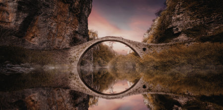 A picturesque stone bridge arches over still water, reflecting the vibrant hues of a sunset. Towering cliffs frame the scene, adding to the serene and majestic atmosphere.