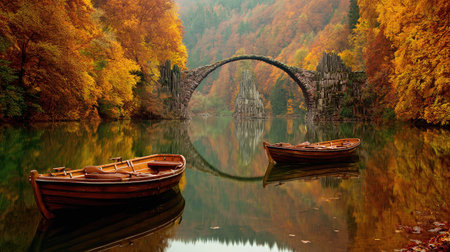 Two small wooden boats float on serene water beneath an arching stone bridge. Autumnal foliage in shades of yellow and orange frames the scene. The composition features symmetry and reflections. This picturesque view could be suitable for travel, nature, or decorative purposes.