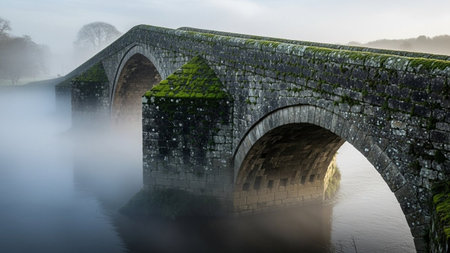 A picturesque stone bridge spans a serene river, enveloped in morning fog. Lush green hills frame the scene, creating a tranquil and mystical atmosphere in a secluded valley.