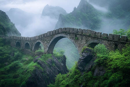 Misty ancient stone fortress bridge in serene mountain landscape at dawn s gentle light