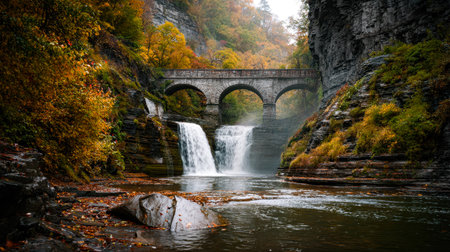 Golden leaves frame a gentle cascade over rocks, crossing a rustic stone archway amid vivid autumn hues and tranquil waters, evoking peaceful seasonal beauty.