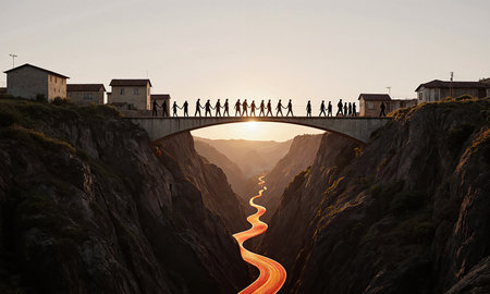 A glowing ribbon forming a bridge between two disparate communities across a canyon, populated by tiny silhouettes walking hand-in-hand, panoramic