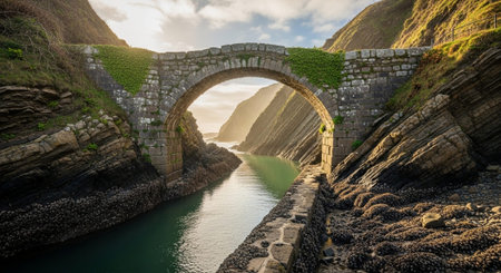 A picturesque stone bridge arches gracefully over tranquil waters, reflecting the vibrant hues of a sunset. The scene is framed by rugged cliffs and bathed in warm, golden light.