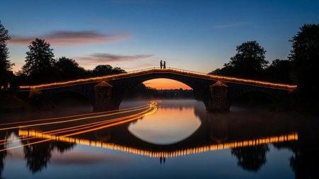 A tranquil scene of a lone bridge with soft white light trails creating an ethereal atmosphere over the flowing river