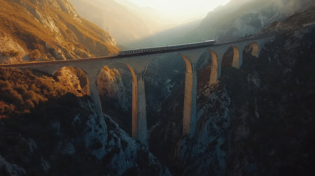 A train glides smoothly across a dramatic viaduct, illuminated by the warm glow of golden hour light, showing the vastness of the surrounding gorge and mountains.