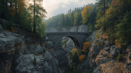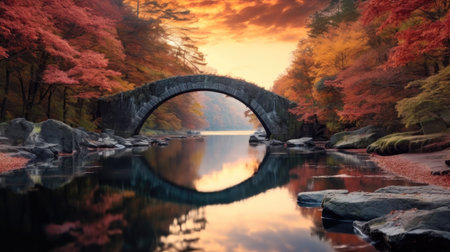 Stone arch bridge over tranquil water in autumn forest landscape generated by artificial intelligence