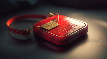This stunning image features an ornate golden card case embellished with intricate floral patterns resting on luxurious red fabric. The design evokes elegance.