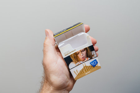 Hand holding Marlboro cigarette pack unhealthy life concept for damage to health