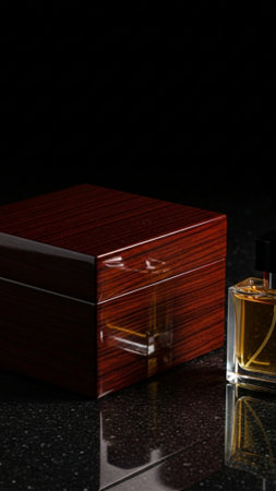 Vertical, tall 9:16 photograph of a luxury dark wooden watch box and an elegant cologne bottle side-