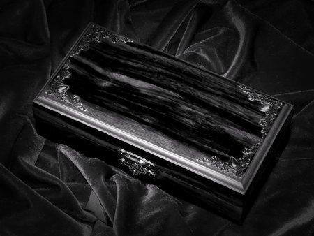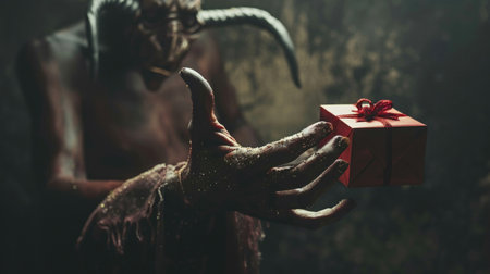 Scary monster hands with sharp claws reaching for an antique wooden chest in the darkness, symbolizing fear, danger, and the unknown being unleashed from a forbidden container