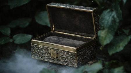 An exquisite vintage decorative jewelry box sits amidst lush greenery and a wispy fog, creating a captivating and mysterious atmosphere perfect for enchanting stories.