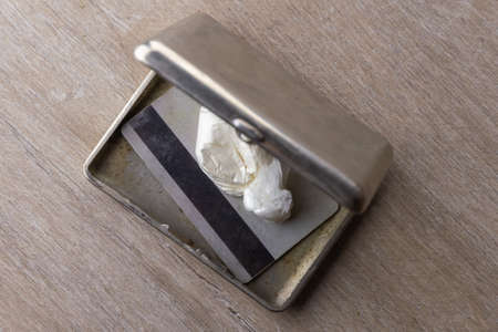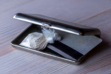 The dose of cocaine in a plastic bag and a card inside an open old cigarette case, top view