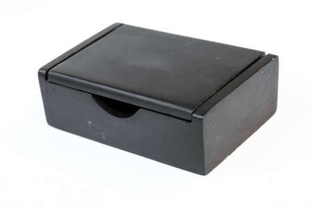 A dark wooden treasure chest with lid closed on wooden table. Selective focus