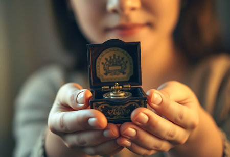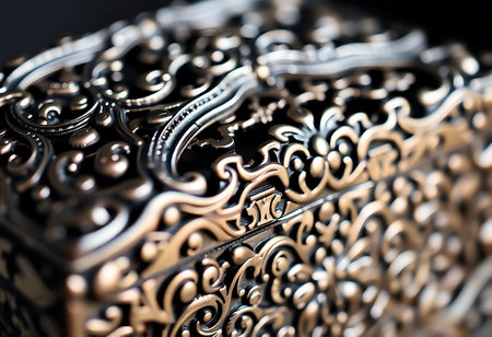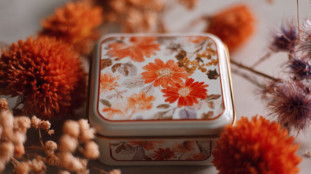 This image features a detailed gold-plated box adorned with an intricate floral design, set against a warm, textured background. The soft light highlights its luxurious appeal.