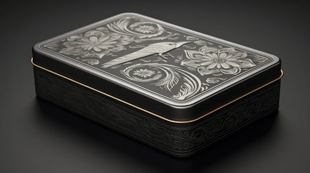 An opulent packaging in a black and gold metal tin box with a geometric pattern, featuring a simple yet advanced illustration with hot stamping