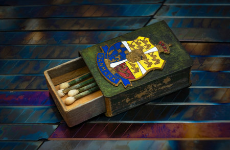 old matchbox with emblem of Denmark on abstract background made from knife decaled blades heated in the fire