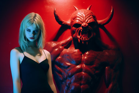 silhouette of a woman with horns and devil horns in red and blue