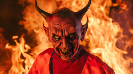 Man in Devil Mask and Suit with Flames, Portrait of Confidence Against Fiery Backdrop