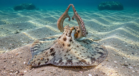 A vivid octopus rests gracefully on the ocean floor, surrounded by coral reefs. This underwater scene captures marine beauty and ecological harmony.