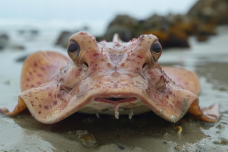 A stingray with its head up on the beach, high quality, high resolution