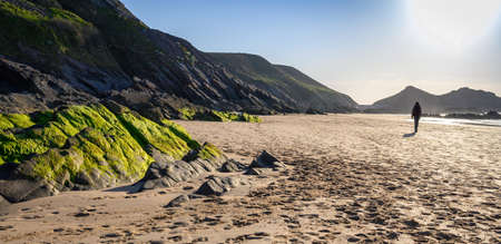 Hiker on the beach during the sunset, in brittany Erquy