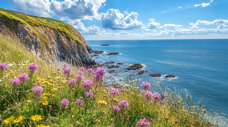 A stunning coastal landscape showcases rugged cliffs meeting the turquoise sea, adorned with vibrant wildflowers under a blue sky filled with fluffy clouds.