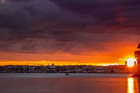 Setting sun breaking through flaming clouds over historical suburb of Devonport. Auckland, New Zealand