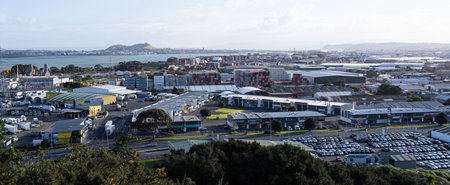 Outdoor landscape in the city of Auckland, New Zealand. Cloudy sky and view of the port. Auckland panoramic photo.