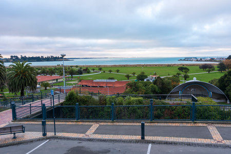 Timaru's Caroline Bay as seen from SH1 looking north showing the park, the sound shell and the bay. To the right the port