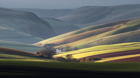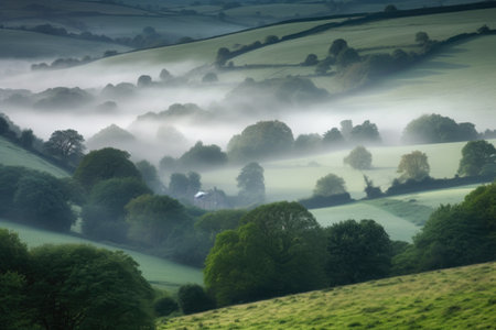 rolling countryside landscape, with dense fog and mist rolling in the hills, created with generative ai