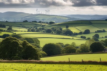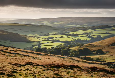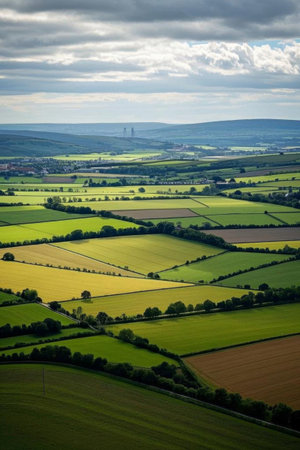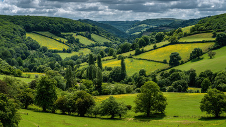Captivating view of rolling green hills adorned with vibrant fields and trees under a moody cloudy sky, showcasing nature's beauty.