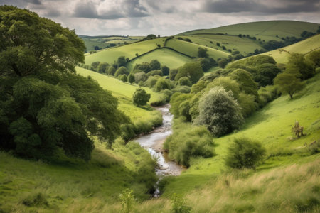 rolling countryside hills, with winding stream and towering trees, created with generative ai