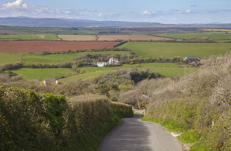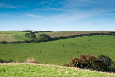 Cornish landscape with fields and meadows and a flock of cows near Port Isaac.