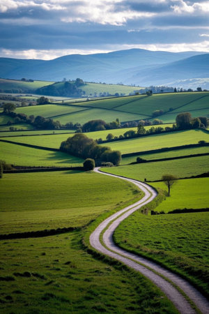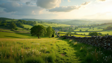 Tranquil English countryside with rolling hills and stone walls under a summer sky
