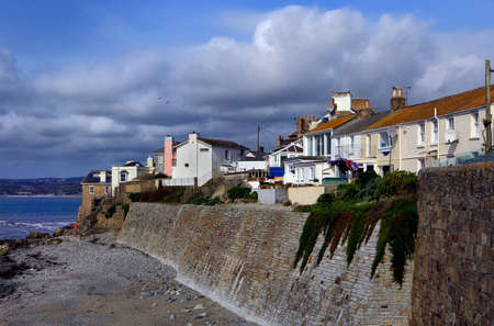 Marazion, Cornwall, UK - April 3 2017: Houses along the top of the sea wall in the Cornish village of Marazion