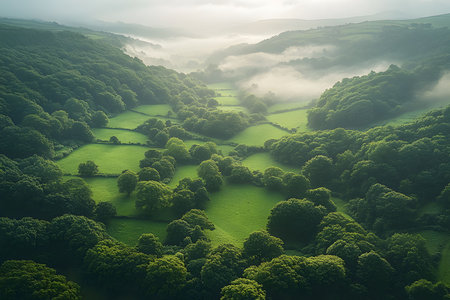 Tranquil aerial view of a lush green valley with fog gently rolling across fields and trees. soft light accentuates the natural texture and contours, creating a serene and peaceful atmosphere ideal for nature-inspired designs. Generative AI