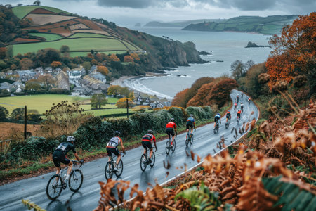 an old stone fence, reminiscent of traditional british landscapes, stands in the foreground. the lens flare adds a touch of warmth to the lively coastal landscape. the dark teal and light orange hues create a captivating contrast. this vernacular architecture captures the charm of idyllic rural scenes, perfect for those who appreciate the cozy and rustic cabincore aesthetic. ai generated