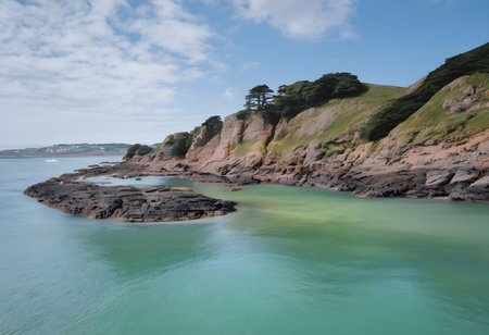 A captivating coastal scene featuring gentle waves lapping against a rocky shoreline, framed by lush cliffs and a tranquil sky, offering a perfect escape into nature.