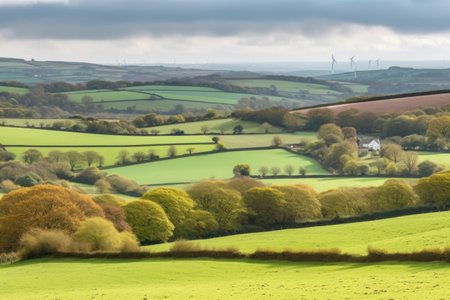 rolling countryside with wind turbines in the background, created with generative ai