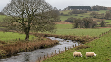 A peaceful countryside scene with rolling hills, a quiet stream, and grazing sheep, creating a calming rural atmosphere.