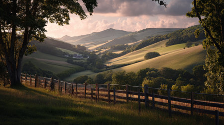 This captivating landscape features rolling hills kissed by golden hour light, framed by trees and a rustic fence, creating a tranquil scene of rural beauty.