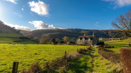 A panoramic shot of a countryside cottage amidst rolling hills and a clear blue sky.