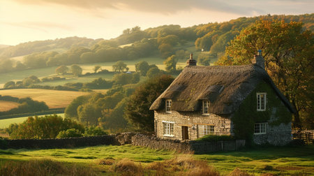 A charming stone cottage nestled in a vibrant green landscape, surrounded by rolling hills and trees, capturing the essence of peaceful countryside living.