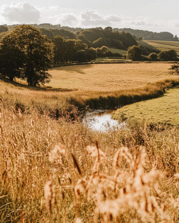 Sunlight bathes the golden fields and gentle hills of the countryside as soft clouds drift above. A calm stream meanders through the landscape enhancing the tranquil atmosphere.