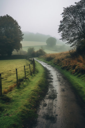 rolling countryside landscape, with dense fog and mist rolling in the hills, created with generative ai