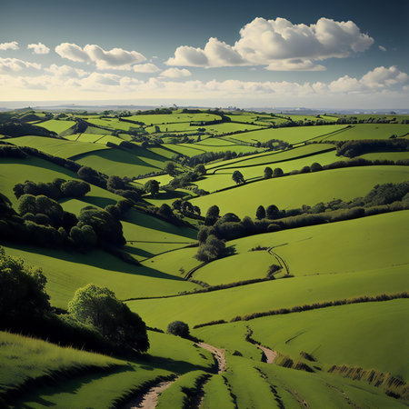 Idyllic English countryside landscape with green fields and rolling hills.